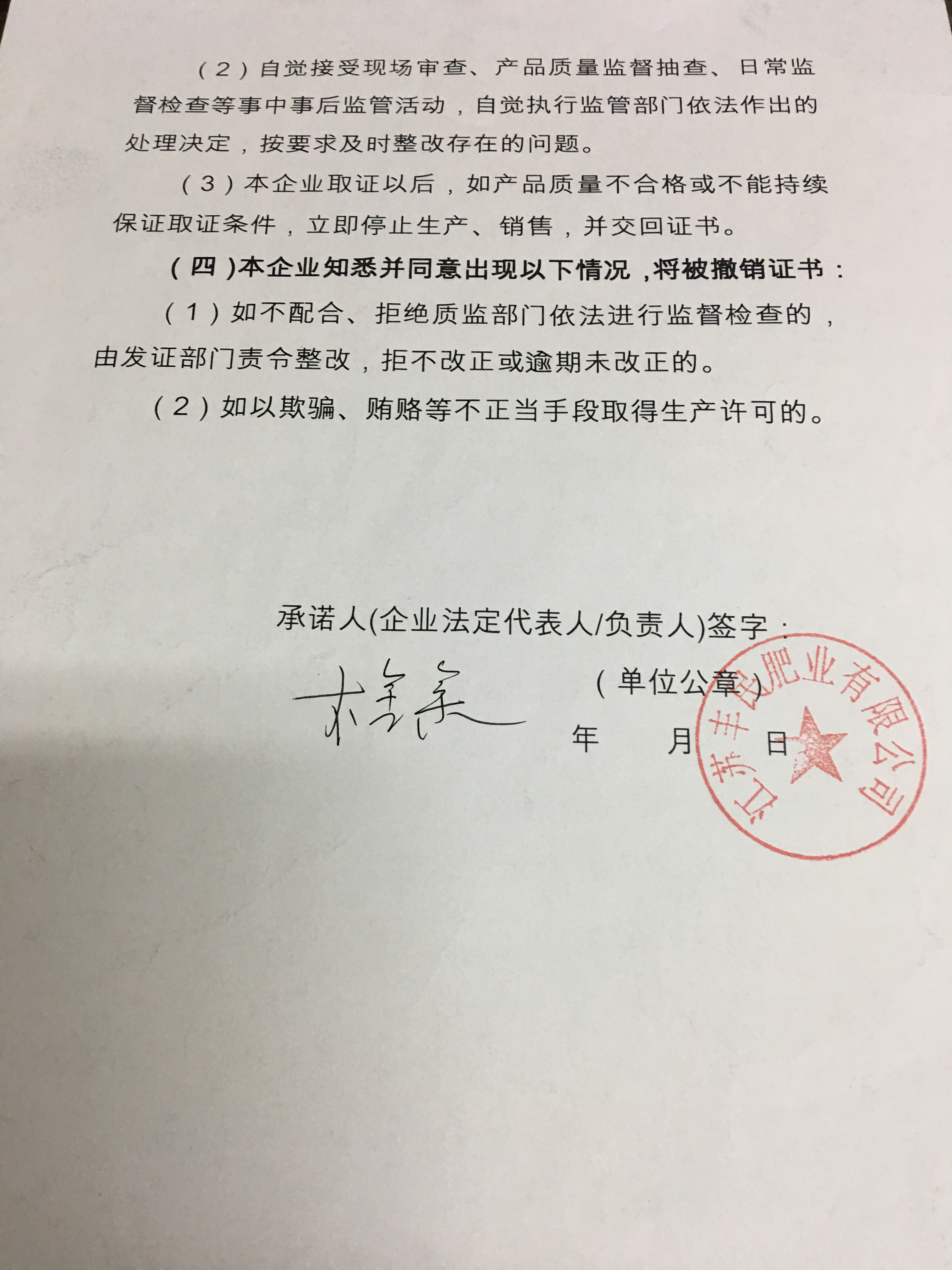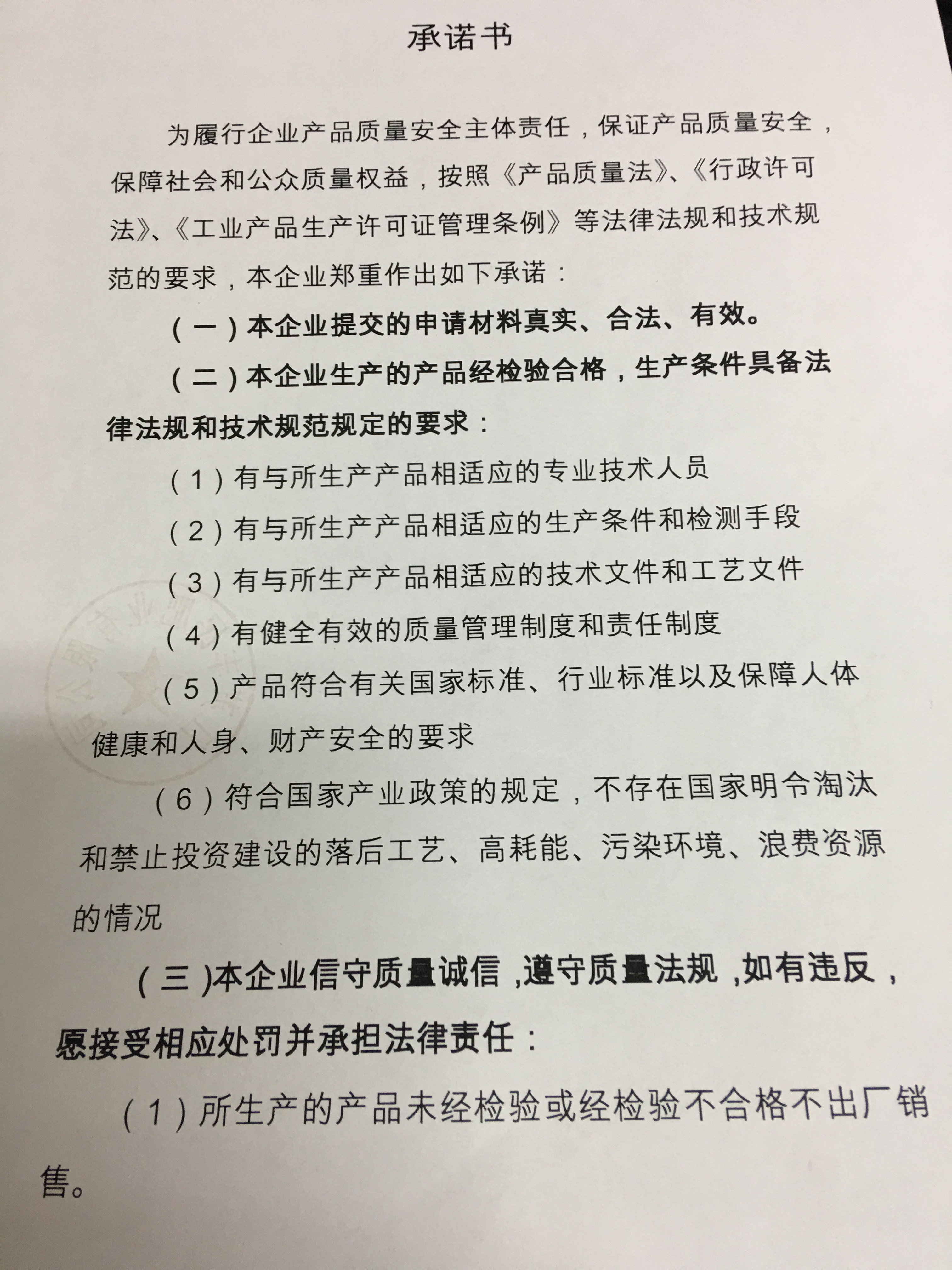 工业类产品行政许可企业(涉改)承诺书