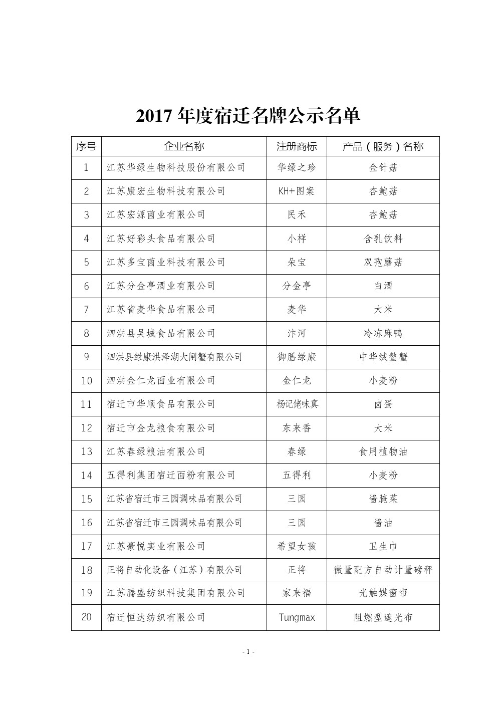 根据《宿迁名牌管理办法》的规定,市名牌战略推进委员会组织了2017年度宿迁名牌申报评审工作。经企业自愿申报、县(区)初审推荐、资格审核、信用核查和市名牌战略推进委员会全体会议审议,拟认定江苏华绿生物科技股份有限公司生产的华绿之珍牌金针菇等41个产品为2017年宿迁名牌,现予公示(名单附后)。